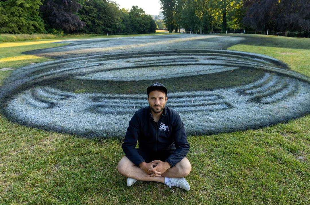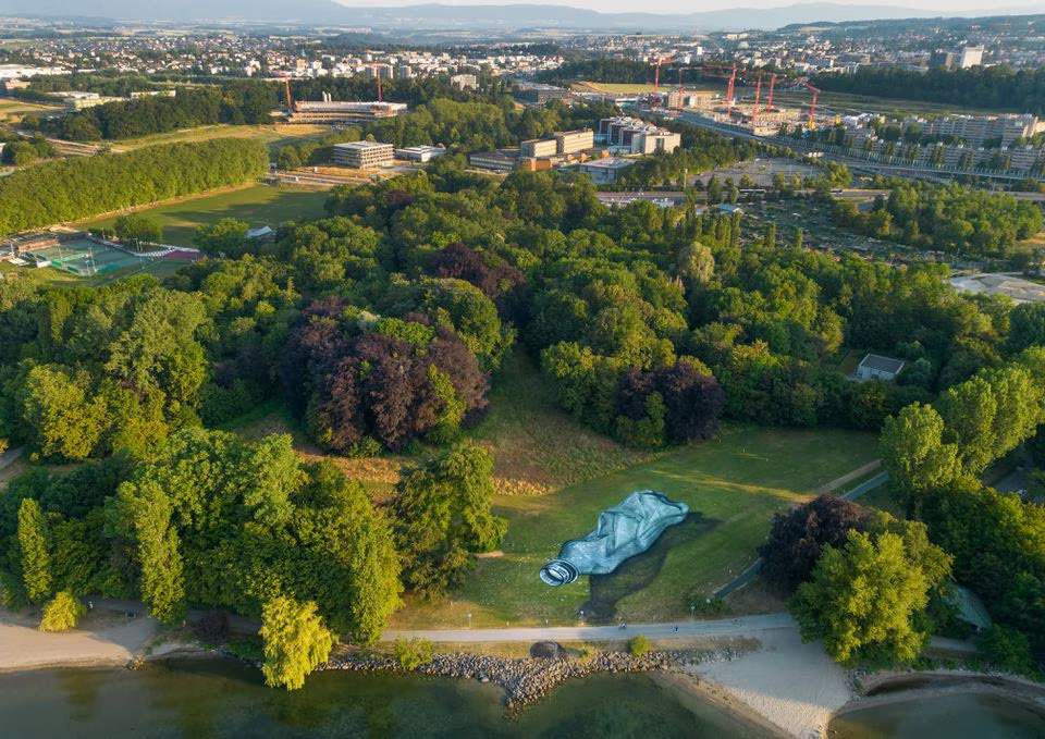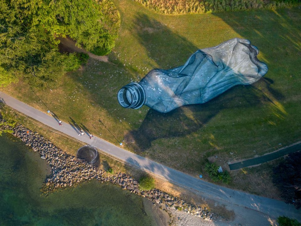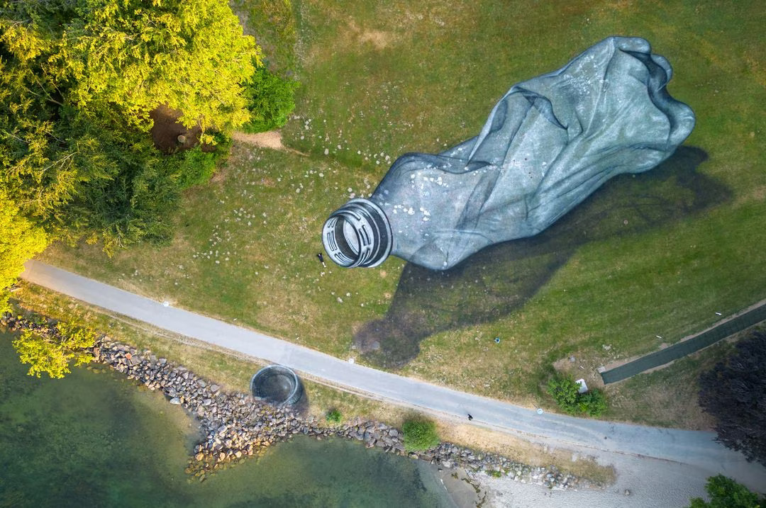 Reuters_ A Swiss-French artist has painted a giant fresco depicting a crumpled plastic bottle directly onto the grass of a Swiss park with a view to raising awareness about pollution.