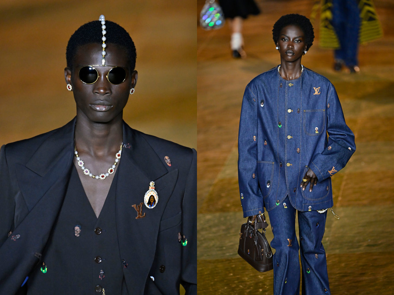 For Williams’ debut collection—which featured pixelated camouflage and other twists on the classic LV checker—was a series of suits embroidered with tiny replicas of Taylor’s portraits. Some of the suits were made of a flowing denim, with the jacket in the shape of an artist’s smock. The other suits were variations on matching waistcoat, a skirt, or a cardigan, all similarly embroidered.