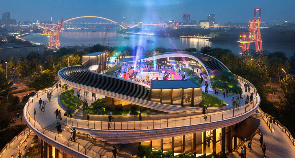 Nestled within the new district and connected to the cultural riverside park, the West Bund Orbit is designed as a public space to be experienced in its entirety, both inside and out. Its facade resembles a stack of interweaving ribbons, resulting in an undulating series of staircases, bridges, and terraces that are accessible to all. These architectural elements provide visitors with the opportunity to ascend to the building’s rooftop garden and enjoy multiple viewing platforms, taking in panoramic views of the river and the entire West Bund area.