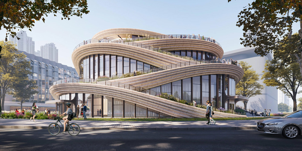 Designboom_ Heatherwick Studio, the British architecture firm, unveils the design of a new exhibition center to be situated on Shanghai‘s emerging West Bund waterfront. Named the ‘West Bund Orbit,’ this building will stand at the heart of the new Financial Hub in the Chinese city’s Xuhui District, making its mark on the Huangpu riverside and becoming a prominent landmark in the area.