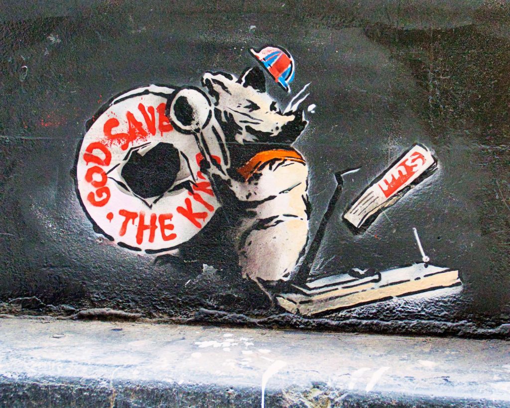 One piece showed a rat playing a broken marching drum emblazoned with the words “God save the king” and wearing a hat with the colors of the Union Jack. Its tail is caught in a trap baited with a copy of the Rupert Murdoch-owned British tabloid newspaper The Sun. Spotted on Wednesday, it was partially painted over by Thursday, according to the BBC.