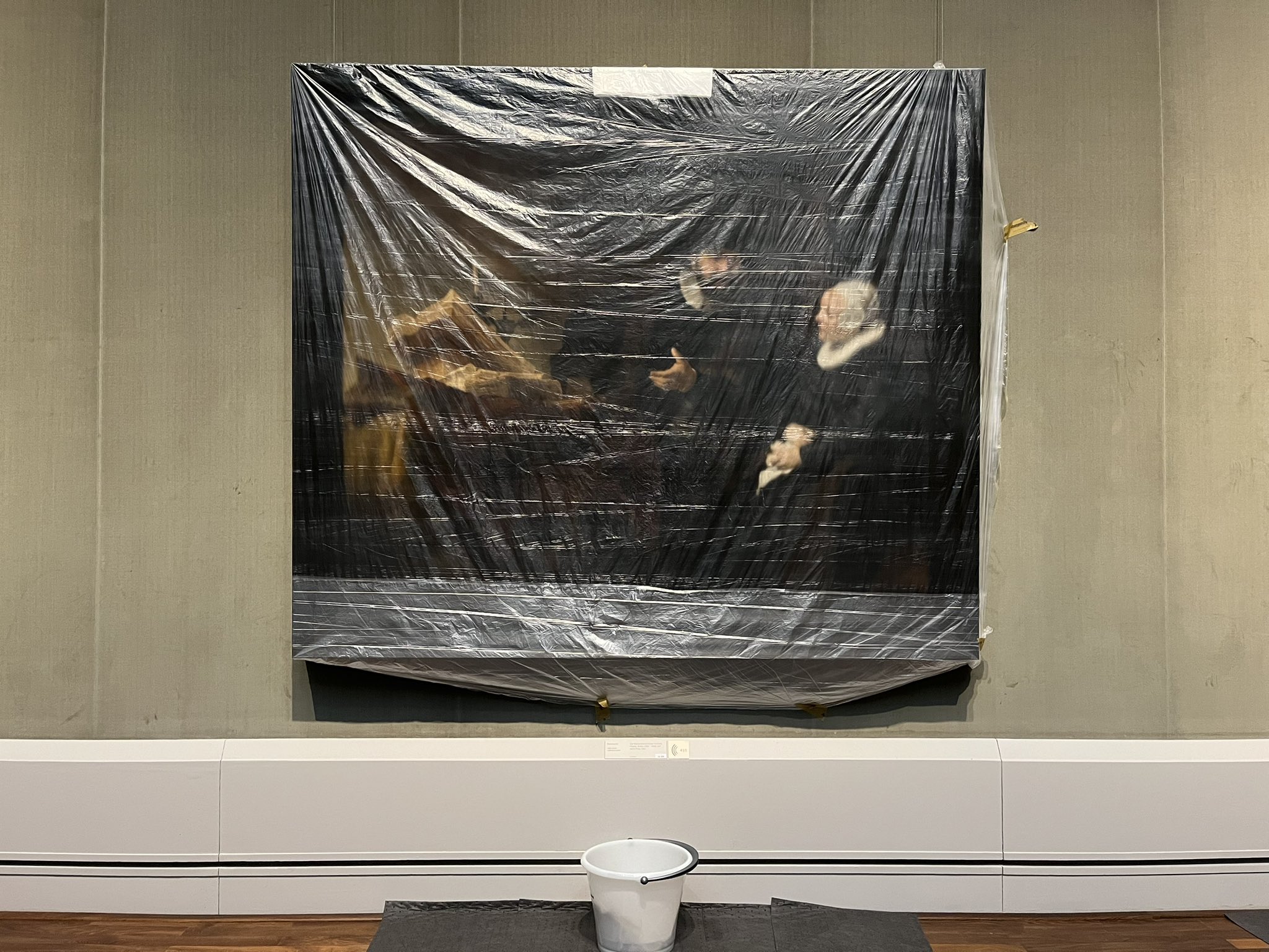 “A monumental Rembrandt covered in plastic and duct tape while a steady patter of drops land in a bucket an inch or two in front of the painting. Stressing me out,” David Grubbs, a professor at Brooklyn College who noticed the leak at the Berlin museum last week, wrote on Twitter.