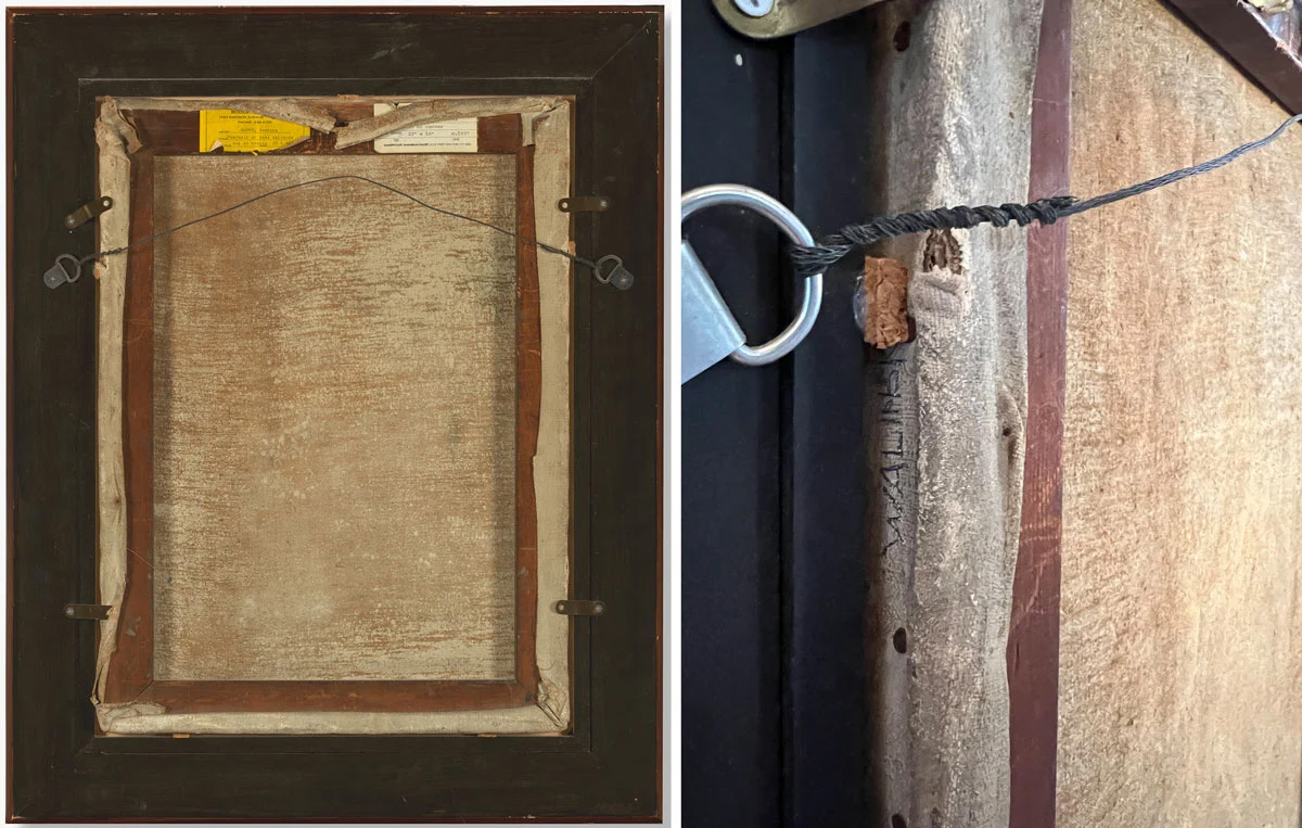 At left, the reverse of Gorky’s Portrait of Anna Walinska (ca. 1937), and at right the painting’s right tacking edge, with “WALINSKA” inscribed on it