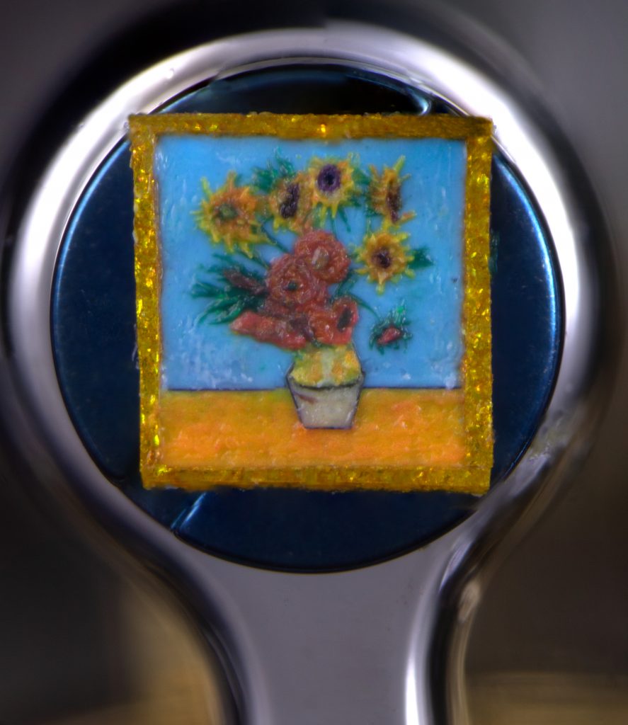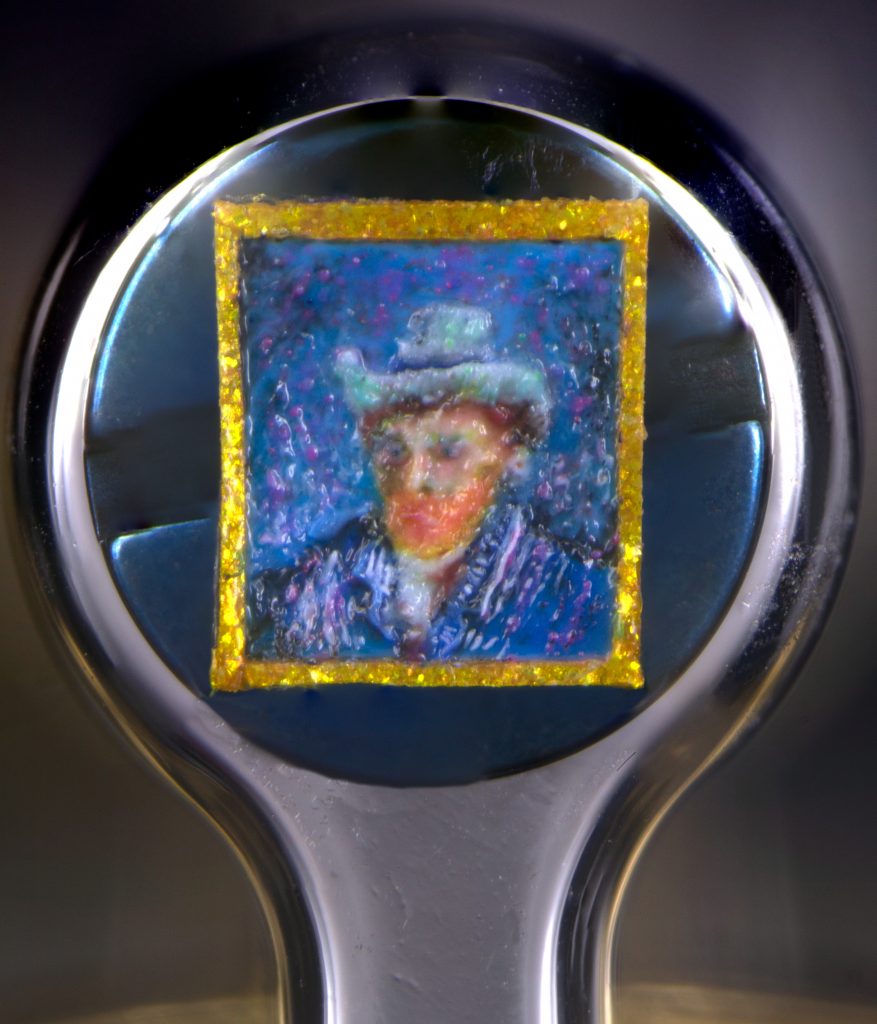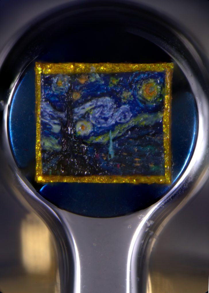 The paintings—Starry Night (1889), Sunflowers (1888), and Self-Portrait with Grey Felt Hat (1887)—have each been recreated by the British artist David Lindon. Each measures about half a millimeter.