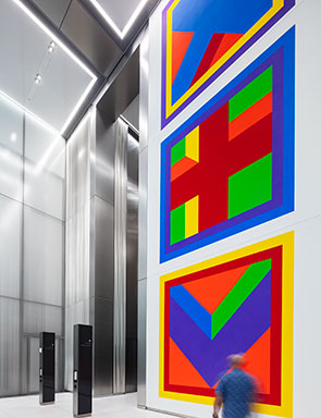 The original artwork, titled “Bars of Color within Squares,” features geometric configurations, vibrant colors and isometric perspectives that create a sense of volume, making it appear to pop from the wall. At 39 feet tall by 13 feet wide, the massive piece is easily visible to all passersby on Park Avenue. L&L in collaboration with Lord Norman Foster worked with Peter Cooper Gallery to procure the artwork. The installation was handled by dedicated artists and craftspeople from LeWitt’s estate, who adhered strictly to specifications left by LeWitt prior to his passing in 2007.