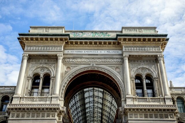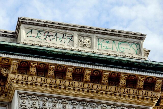 Reuters_ Graffiti artists have scaled and tagged the soaring stone entrance to Milan's Galleria Vittorio Emanuele II, the prestigious shopping arcade at the heart of the city.