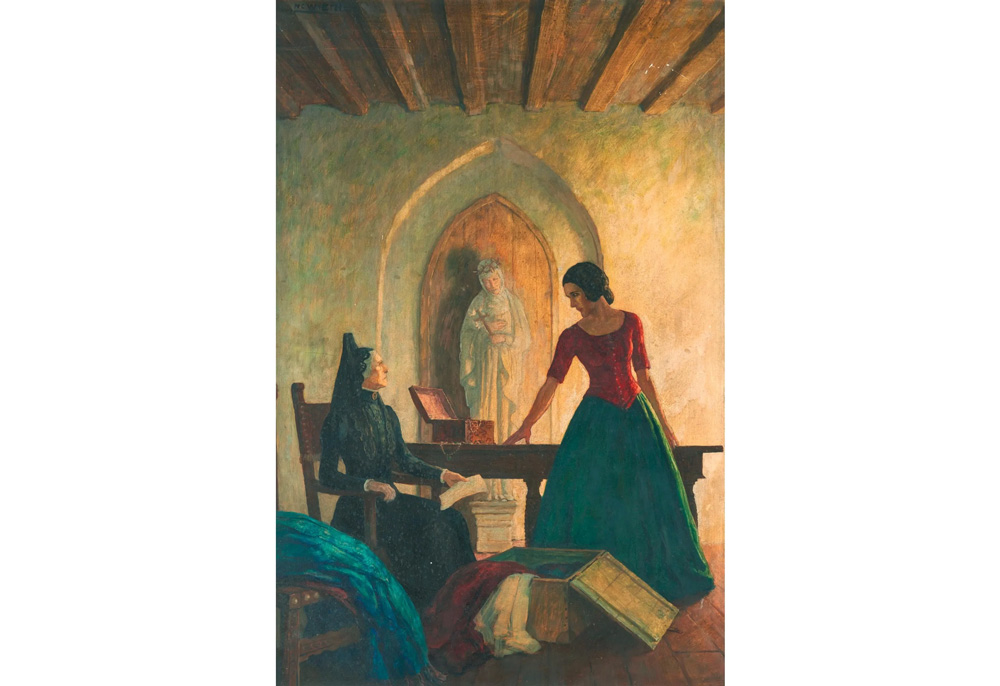 According to Bonhams auction house, the artwork was actually an oil panel illustration by the artist Newell Convers Wyeth, father of the more-famous Andrew Wyeth. The painting was one of four cover illustrations for a 1939 edition of the Helen Hunt Jackson novel Ramona.