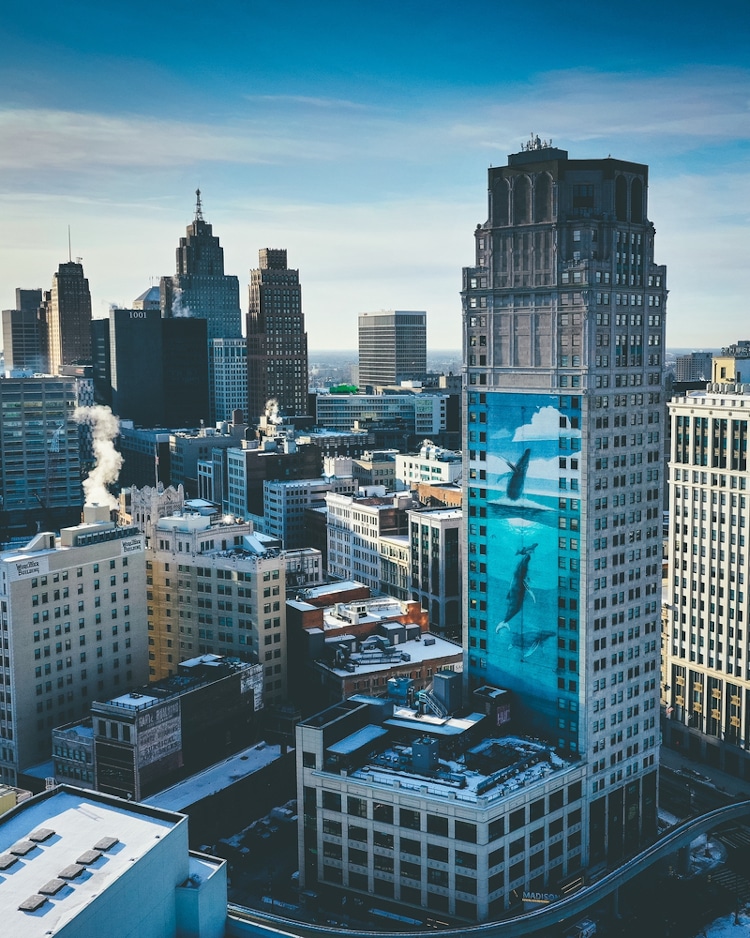 This large-scale piece was created by Michigan-born artist Robert Wyland in 1997. Painted on the rear façade of Broderick Tower in Downtown Detroit, the mural covers 20 floors of the 34-story building, depicting a group of whales swimming in the ocean. On top of its prime location within the city, its vicinity to Comerica Park, home of the Detroit Tigers baseball team, allowed fans to gaze at the painting from the stadium stands.