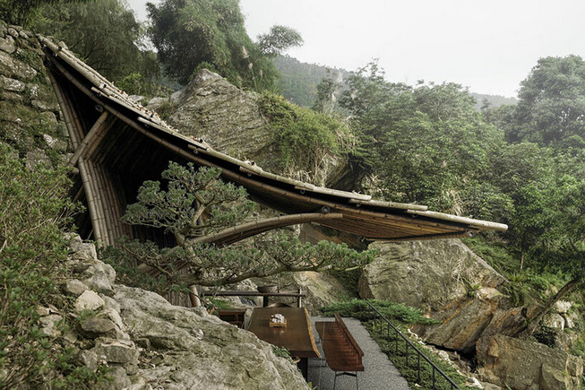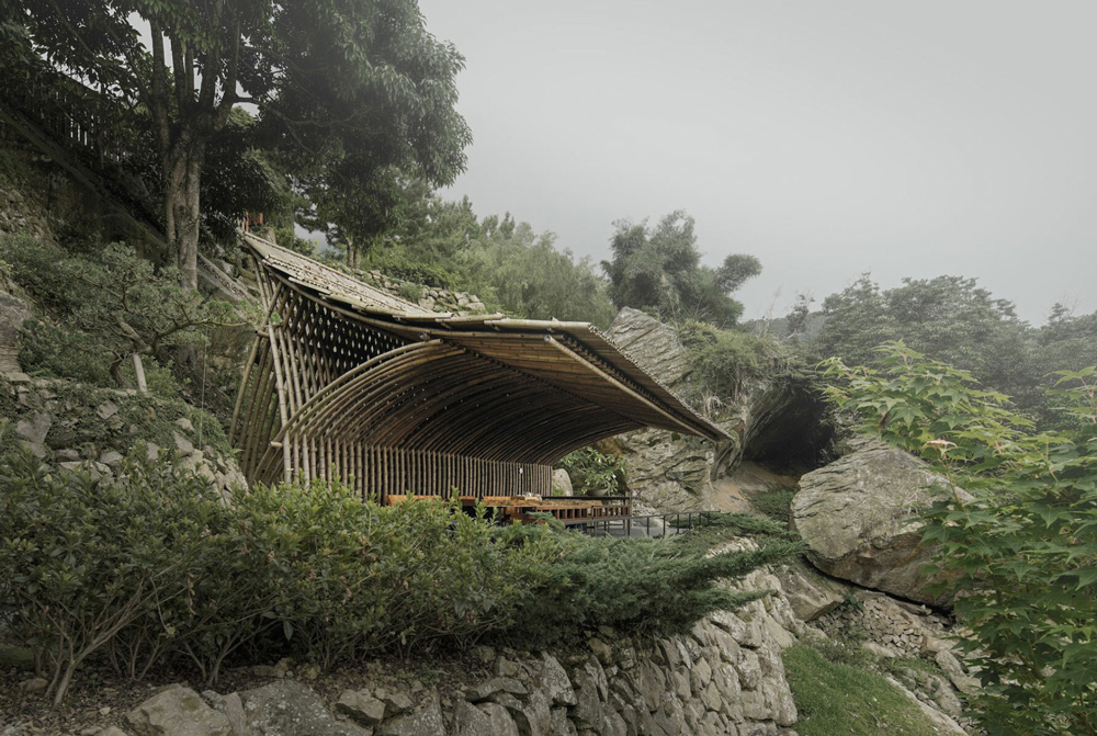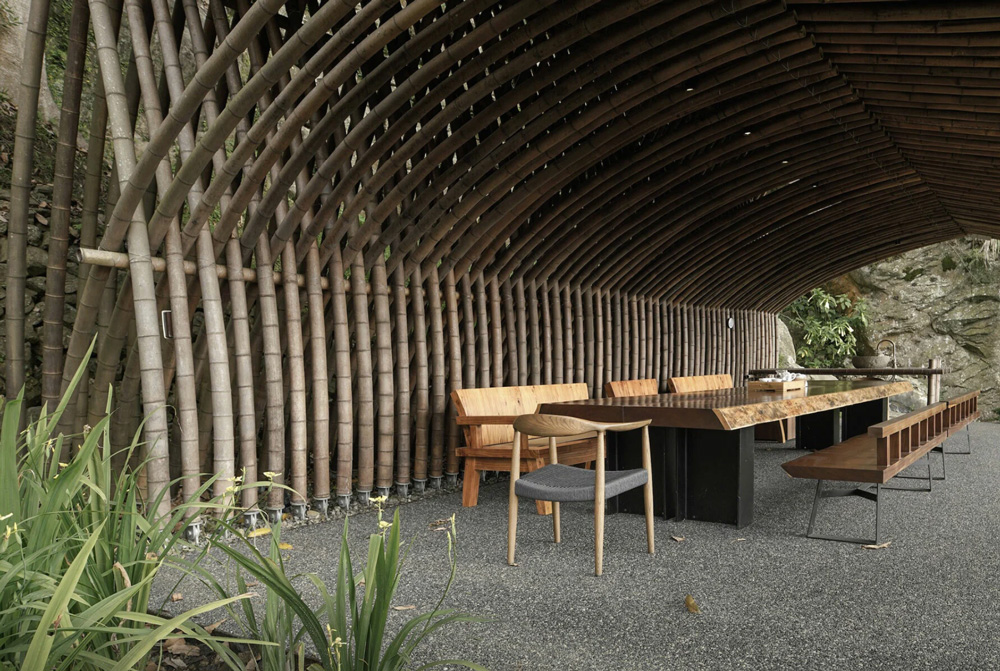 Designboom_ In Taiwan‘s forested region of Nantou, German and Taiwanese-based studio Behet Bondzio Lin Architekten crafts this Clear Water Tea House in sculptural bamboo. This tranquil teahouse is perched along the edge of a slope at an altitude of 700 meters (2,300 feet), elegantly integrating with the surrounding environment. Its core principles of adaptability, sustainability, and holism guide the design process of the tiny structure, redefining the relationship between nature and the modern world.