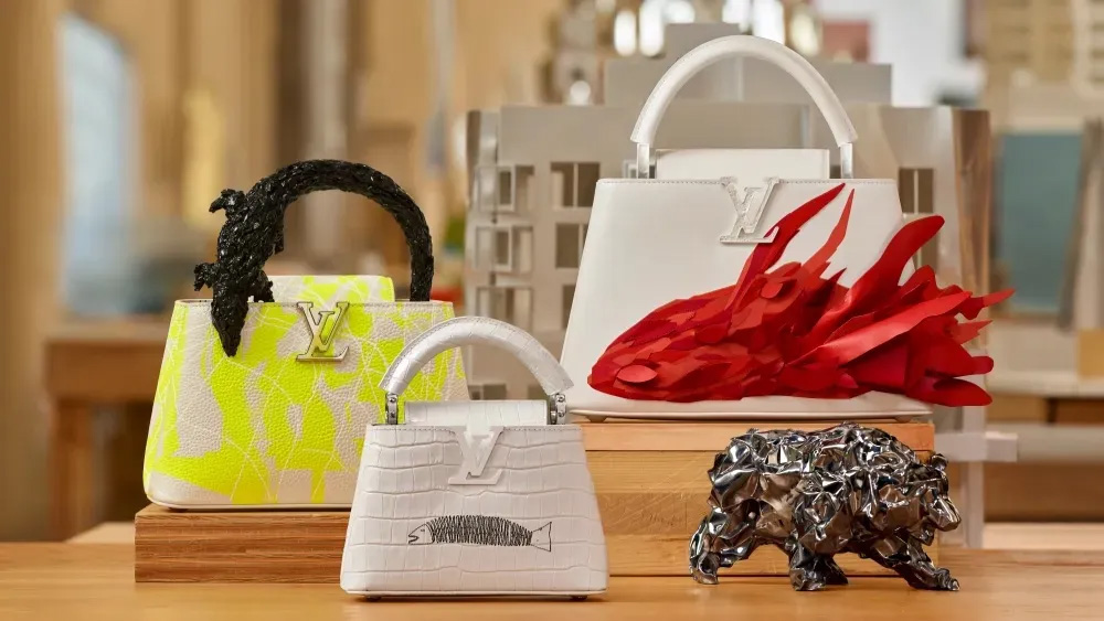 His Capucines MM Floating Fish features a bright red fish with flamboyant leather and sequin marquetry scales, while the Bear With Us clutch is a miniature version of the sculpture of the same name, which looks like it’s made out of crumpled paper covered in metal. “I didn’t expect to make that into a handbag,” he admitted.
