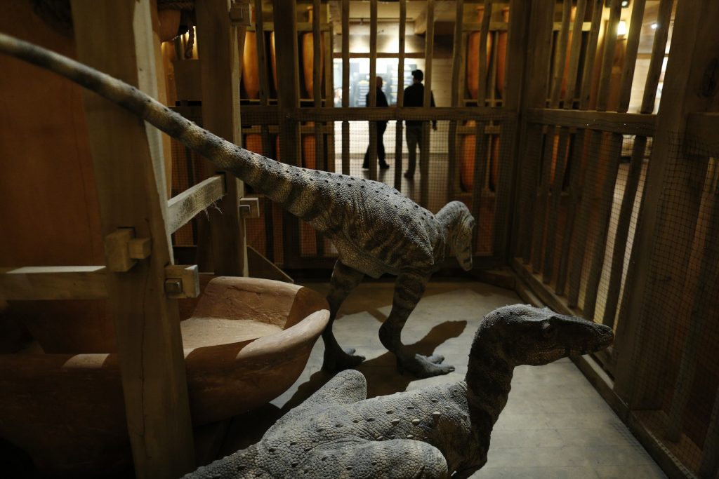 Replica dinosaurs are pictured in a cage onboard a life-size replica of Noah’s Ark at The Ark Encounter in Williamstown, Kentucky. (Photo by Luke Sharrett /For The Washington Post via Getty Images)