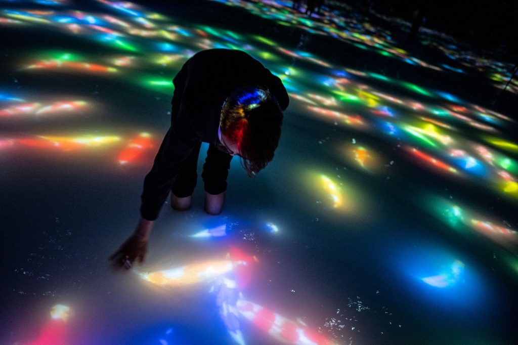 A staff member stands inside an interactive digital installation “Drawing on the Water Surface Created by the Dance of Koi and People – Infinity” during a media preview of the TeamLab Planets Water Area in the Toyosu district of Tokyo on June 29, 2021. (Photo by Philip Fong/AFP via Getty Images)