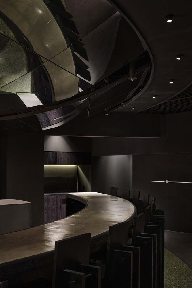 While the overall tone of the space leans towards dark and moody, various finishes in different areas stimulate the palate, aligning with the theme of "gastronomy" in a stage-like setting. From yakisugi, travertine, marble, and red copper to traditional Korean brush painting (chilbo), diverse finishes each contribute unique hues, serving as accents throughout the space.