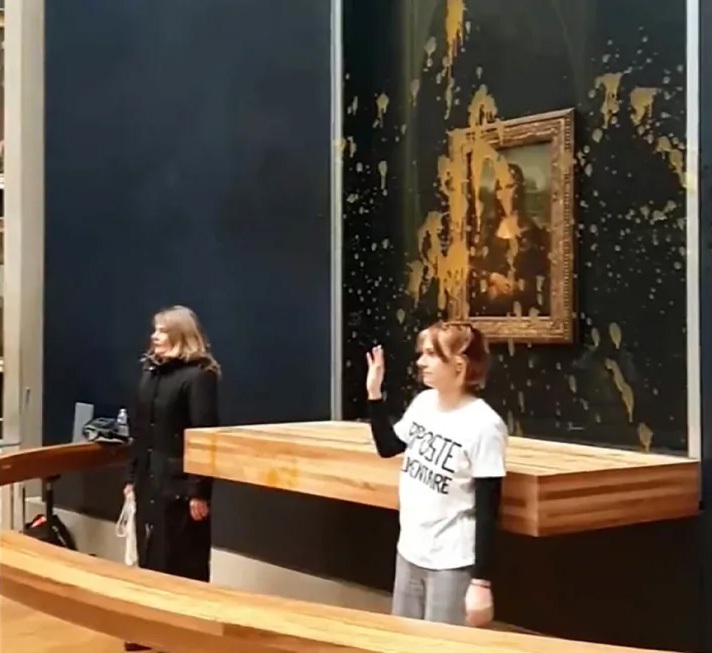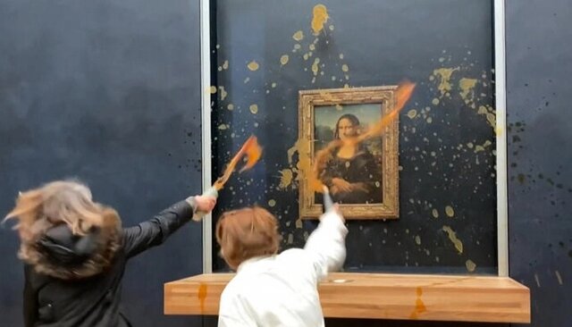 “Two activists from the environmental movement ‘Riposte Alimentaire’ sprayed pumpkin soup on the armoured glass protecting the Mona Lisa, this Sunday, January 28, 2024, around 10am (4aET),” a statement from the museum said.