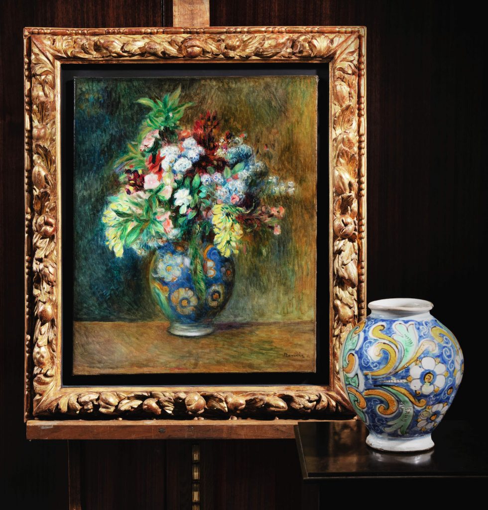 Renoir’s focus on majolica actually has a personal echo for the artist himself, since he started his career as a painter on porcelain and was born in Limoges, a center for porcelain production in France. According to the house, the vase appears to have been made in about 1700 in the Sicilian city of Caltagirone, a center for the production of majolica.