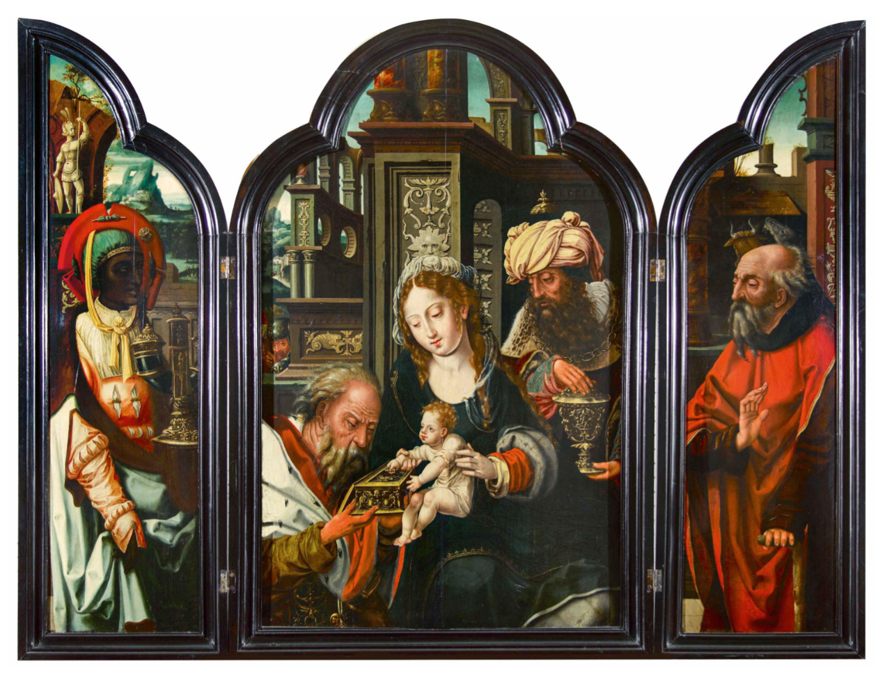 Across three panels, the painting depicts the Adoration of the Magi, wherein the three wise men recognize Jesus as the son of God and bring him gifts, with Saint Joseph shown on the right and Balthazar on the left.