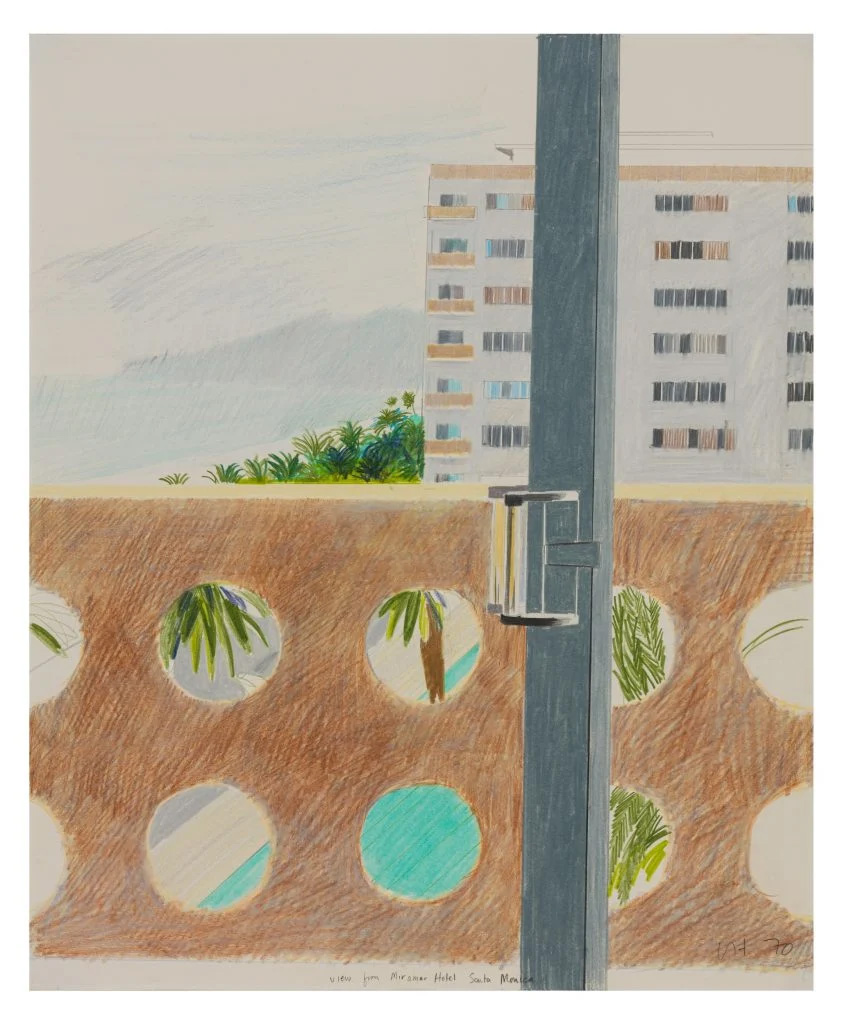 The artist would resettle in London in 1968 but made a return visit to L.A. in 1970, staying at the storied Miramar Hotel, which had been converted from a Victorian-period mansion. In the drawing, which measures 17 inches high, one looks out from behind glass doors from a poolside bungalow and through the perforations in the wall of a balcony, beyond which lie palm trees and a swimming pool, with the foothills of the Santa Monica Mountains in the distance.