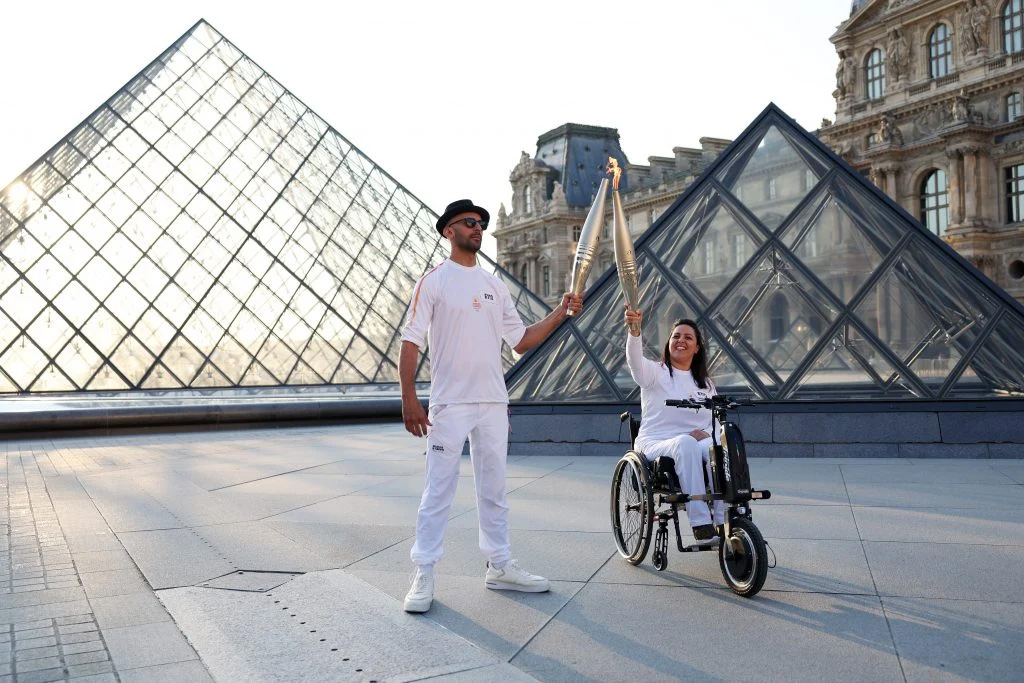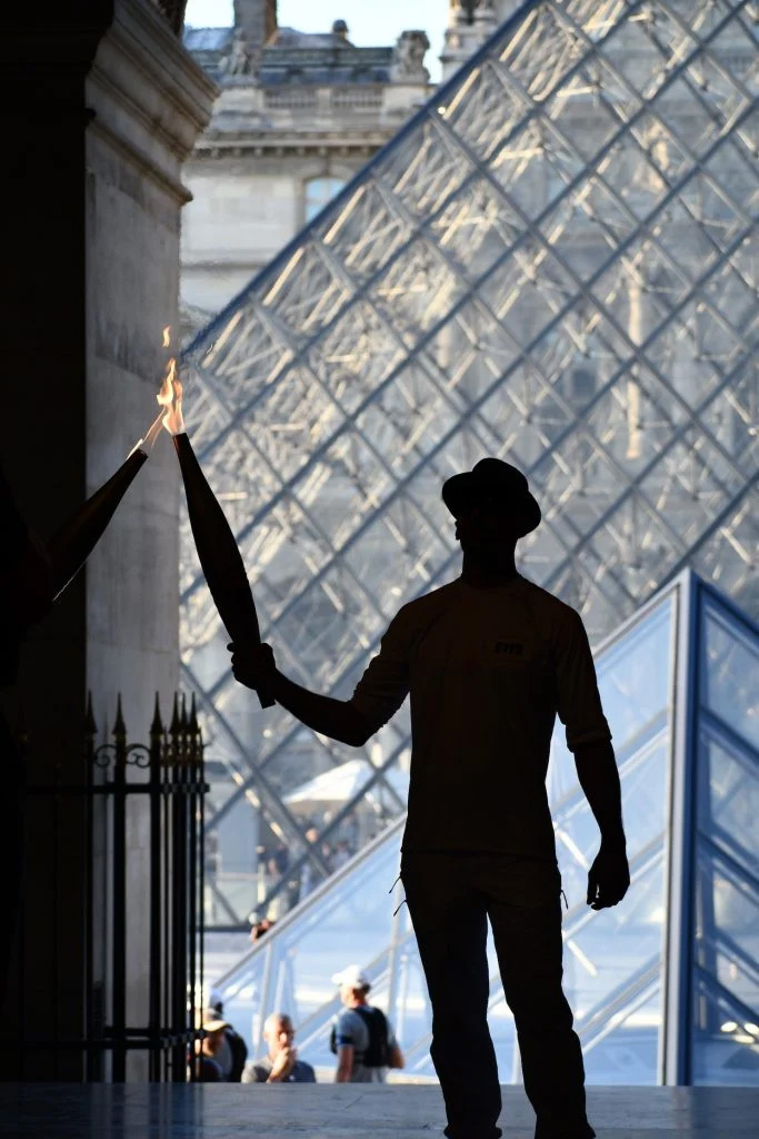 Once the torch was inside the Louvre, French dancer and choreographer Marie-Claude Pietragalla carried it past masterworks such as Liberty Leading the People by Eugène Delacroix, dramatically posing to mirror the painting.