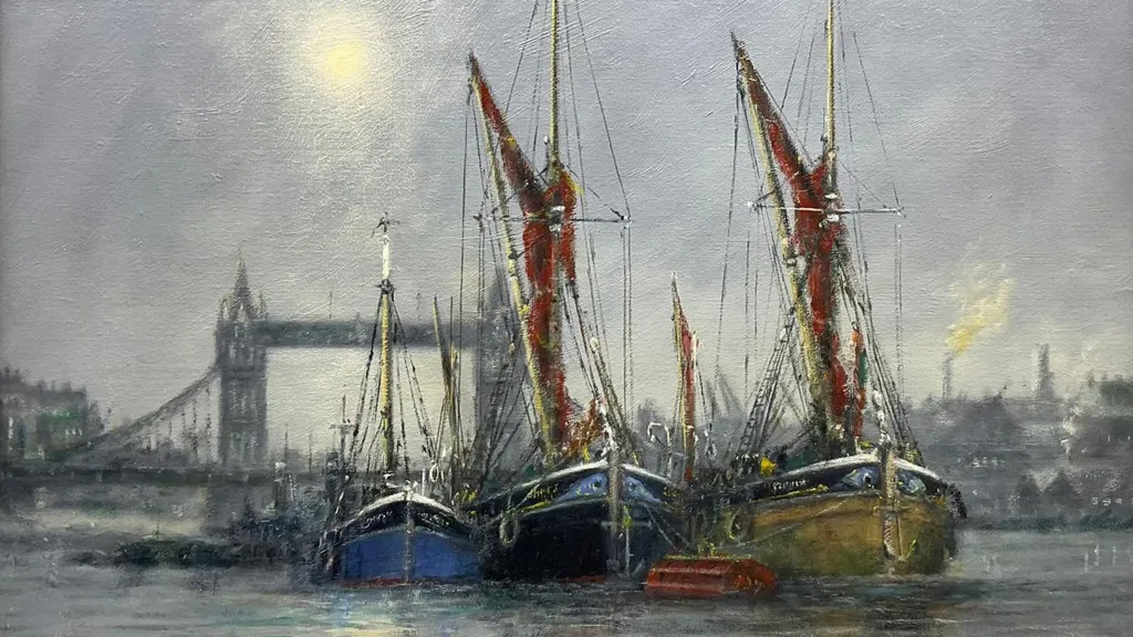 The highest bid, of £1,900, was made by a British buyer for "London View", a moonlit view of sailing vessels moored on the River Thames, with Tower Bridge in the background.