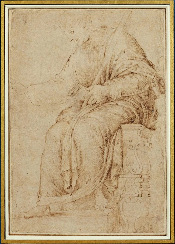 The British Museum’s Nicholas Turner initially attributed the drawing to Michelangelo’s teacher Ghirlandaio, because Ghirlandaio’s distinctive tear-drop folds appear in Jupiter’s robe. Drawing marbles from life was trendy in the 15th century, and Ghirlandaio could’ve easily traveled to Rome, where Jupiter Enthroned was on view. Discrepancies between the study and the marble, however (like the position of Jupiter’s left foot) led experts to believe this drawing was done from another drawing—not life. They began attributing it to a pupil of Ghirlandaio. One such student, Fra Bartolommeo, was floated and subsequently shot down.