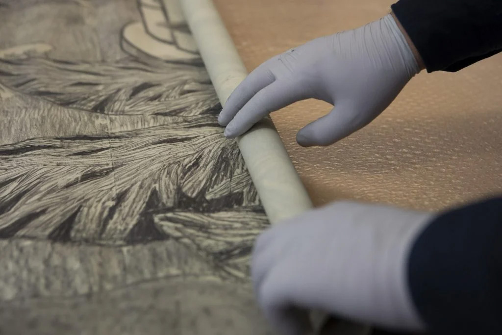 Unrolling of Tove Jansson’s preparatory charcoal studies at HAM: sketch for Bird Blue (1953) © Tove Jansson Estate. Photo: HAM / Maija Toivanen