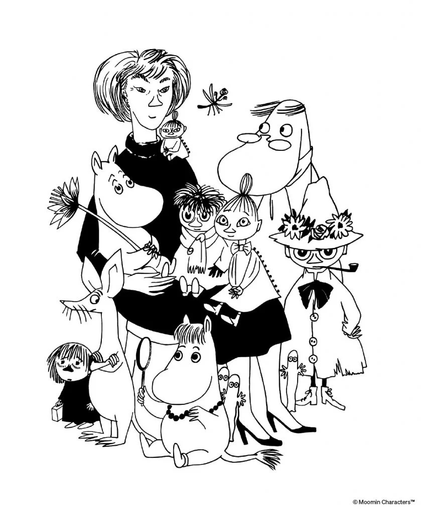 Tove Jansson's selfportrait with the Moomins. © Moomin Characters