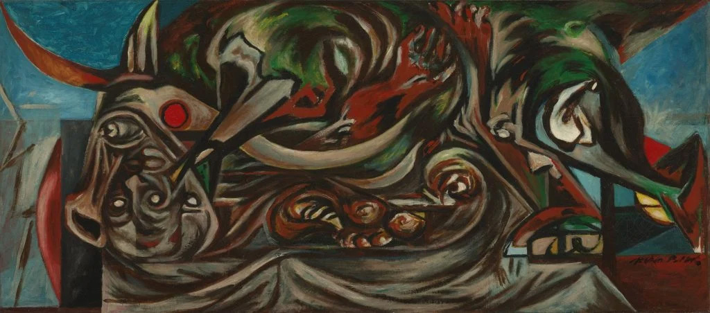 Pollock was very sensitive to the work of Picasso, particularly at the end of the 1930s and beginning of the 1940s, after having seen Picasso’sGuernica[1937], along with a large body of his work and preparatory drawings in a major 1939 MoMA exhibition, and just prior to that, a show at New York’s Valentine Gallery. Pollock often cited the work of Picasso, and was interested in some of this themes, like figures of the bull and horse seen inGuernica, and elsewhere, these tormented figures confronting each other. In the first room, we have the major theme and motif of bullfighting, which interested Picasso and was a starting point forGuernica.