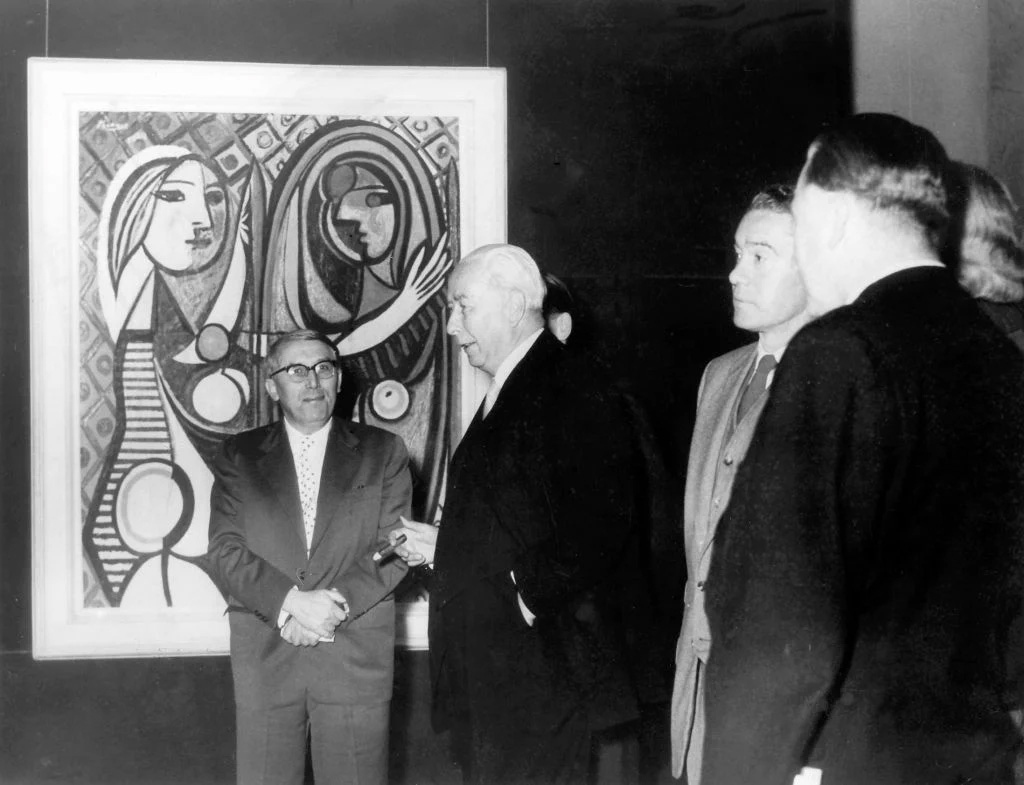 German President Theodor Heuss (second from left) talking with the painter Arnold Bode (left) in front of a painting by Picasso during the first documenta in 1955