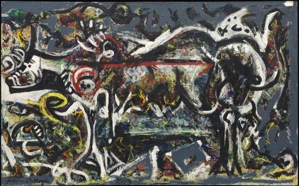 In fact, motifs fromGuernicaare visible here, but reversed and liberally reinterpreted. There’s a woman holding a candle, as well as a tormented bull, or a figure lying on the ground. Pollock also used a more vivid palette thanGuernicain these later, though still early works, and importantly, he painted this on the floor. You can see the imprint of the wooden floorboards showing through, which eventually led to the famous drippings.