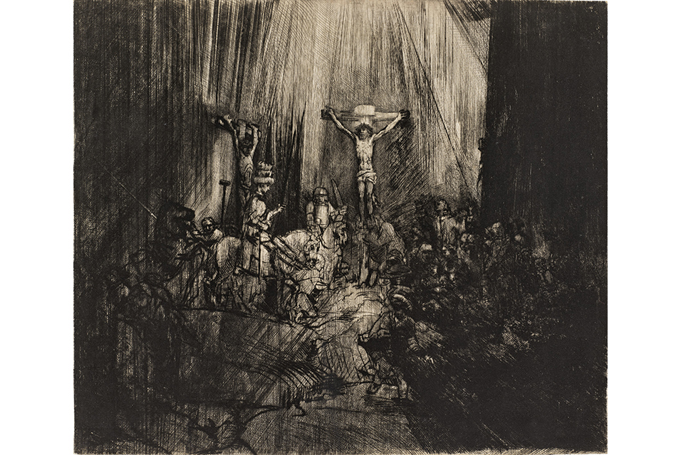 Christ crucified between the two Thieves: 'The Three Crosses' (1653) – this is Rembrandt’s most ambitious and demanding print, a tour de force of draftmanship and printmaking. The artist presents the narrative of the Passion of Christ at the decisive moment, scratching the dramatic scene directly into the copper plate. The impression, previously in the collection of Felix Somary, a renowned collector of prints by Rembrandt and Dürer, is a magnificent example of the fourth state: Rembrandt reworked the plate drastically from the previous state, depicting now a different scene of the narrative, the very instance in which Christ cries out, the moment of greatest drama, despair and chaos. The turmoil of light and darkness and the dramatic tones of the scene are rendered with the heavy vertical shading, with the drypoint a richly black, coal-like burr particularly pronounced and impressive in the Josefowitz impression.