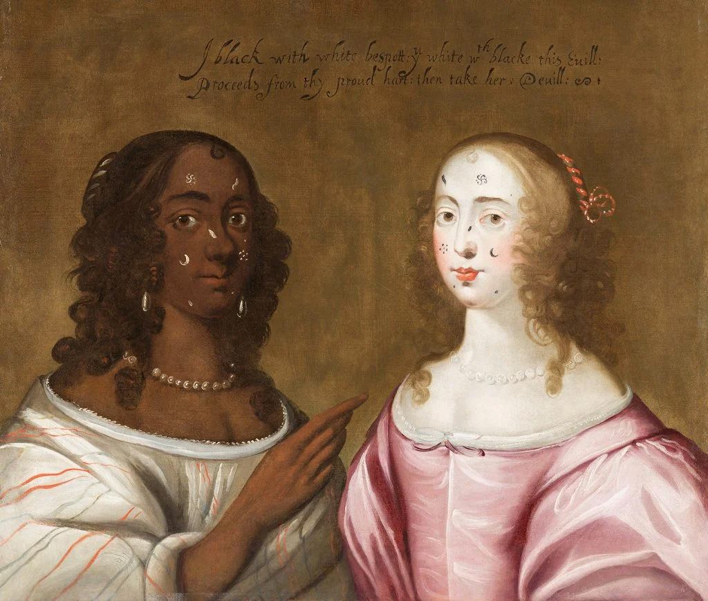 The allegorical painting, Two Women Wearing Cosmetic Patches, was made in around 1655, most likely for Roger Kenyon, a local politician from Lancashire, in northern England. It is not known why it was commissioned. The two women face each other in sumptuous dress and have their faces adorned with cosmetic patches. The Black woman wears white patches while the white woman wears black ones and appears heavily made up, with her cheeks and lips rouged and her skin likely whitened by ceruse.