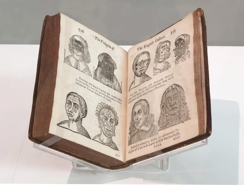 The display at Compton Verney includes two books that provide some context for the painting. One, published in 1663, is Francis Hawkins’s translation of a French conduct guide titled Youths Behaviour, or Decency in Conversation Among Men, which described the use of patches as an “unseemly” custom. It labels a very modestly dressed woman as virtuous while a woman in fashionable but revealing dress and styled hair wearing patches is labelled as “vice.”