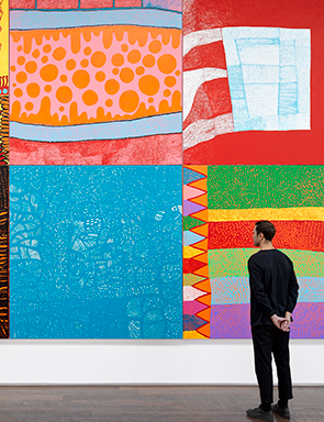 Kusama has painted pumpkins since childhood, and in Infinity Net recalls that ‘I would confront the spirit of the pumpkin, forgetting everything else and concentrating my mind entirely upon the form before me. Just as Bodhidharma spent ten years facing a stone wall, I spent as much as a month facing a single pumpkin. I regretted even having to take time to sleep.’ The works on display, created using the same palette of red, yellow and green, reveal myriad variations of the pumpkin form and its pattern of repeated dots. Varying from evocations of single pumpkins on patterned grounds to almost abstract, vertical forms, pulsating with energy, each painting carries its own distinct mood and character.