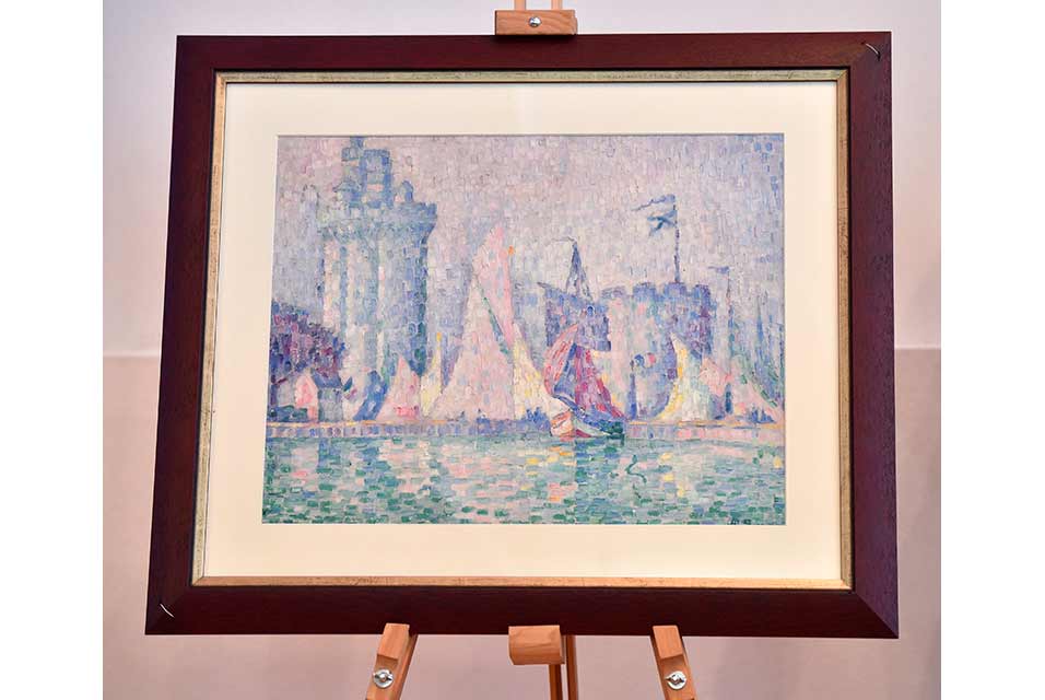A photo shows the painting "Port de la Rochelle" (1915) by French artist Paul Signac (1863-1935) during its presentation at