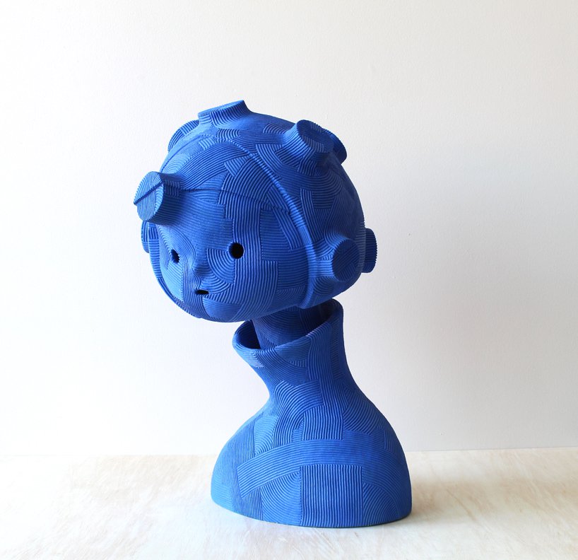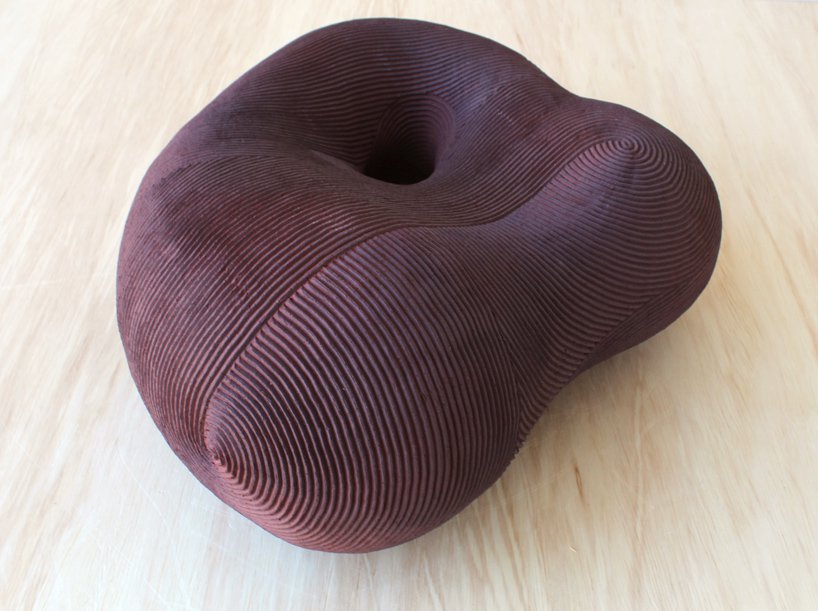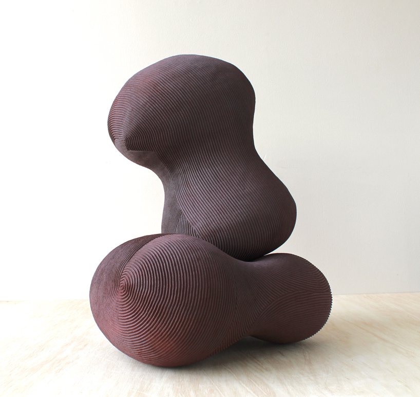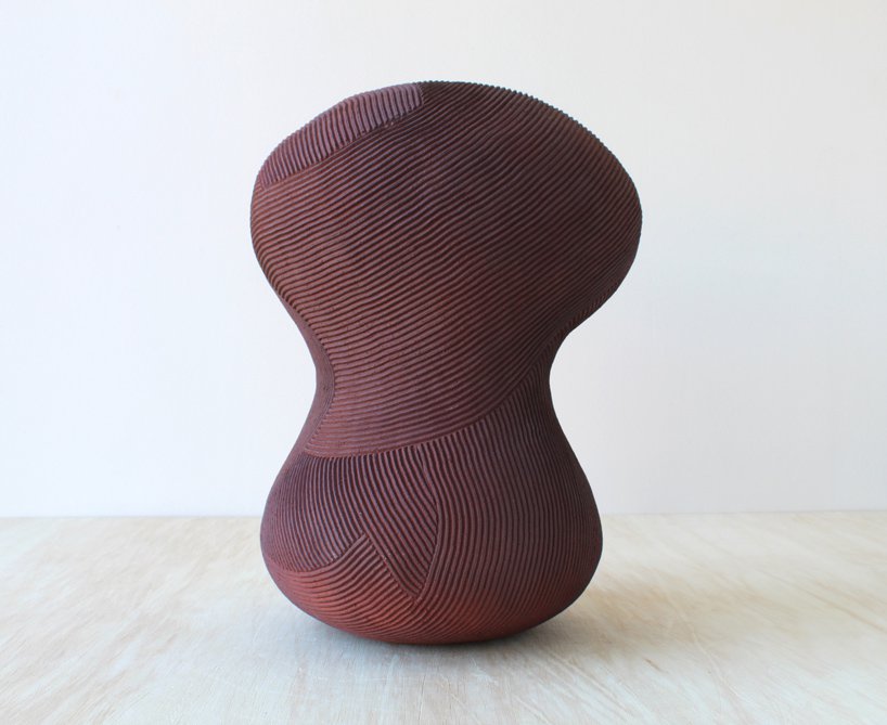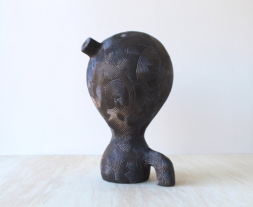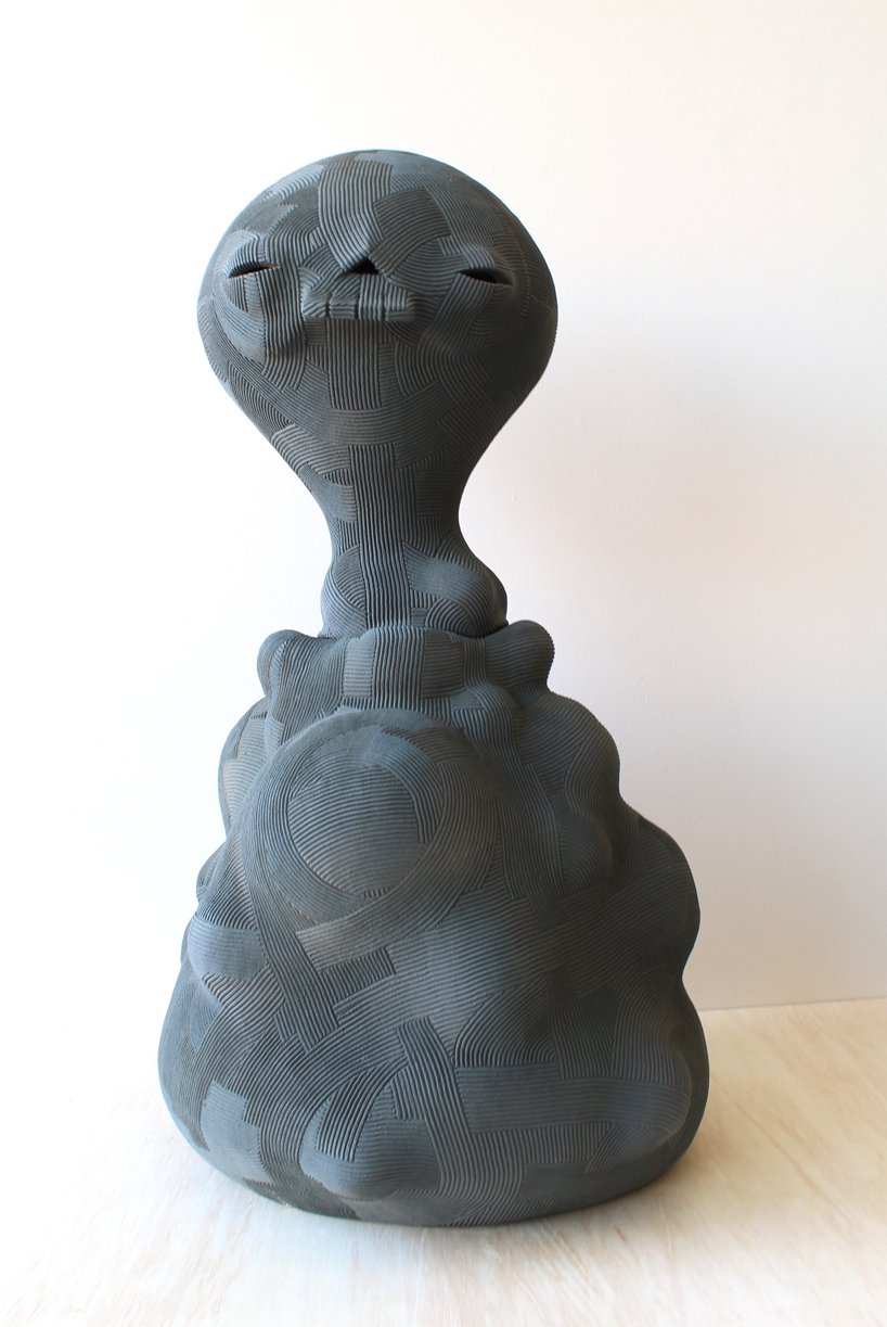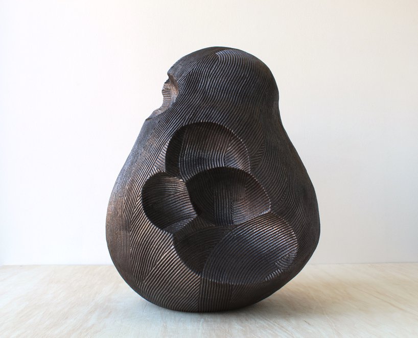 Designboom– through an iterative series of formal studies, japanese sculptor en iwamura investigates the relationship between an object and the space it occupies. en iwamura has referenced the philosophy of ‘ma,’ which explores how objects within a space serve to sculpt the interstitial void to create the ‘essence’ of the space. the artist’s sculpted objects in turn sculpt the space which surrounds them. the occupation of the object within a space influences a viewer’s relationship with that space. the simplicity of the objects defines this experience. a rhythmic surface texture which is methodically swept across the surfaces of the gently curving volumes implies new seams and directionality. in some instances the artist personifies his forms with subtle, expressive features.
