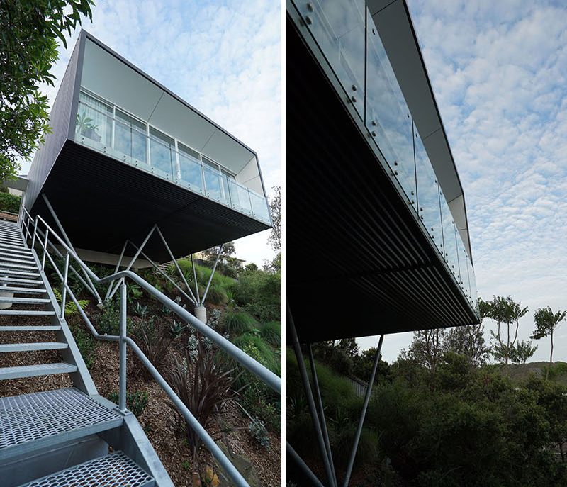 The structure rises up from two deep-set concrete piers with double clusters of steel piloti, which support the building at the front, while the rear rests on top of a suspended off-form tie beam.