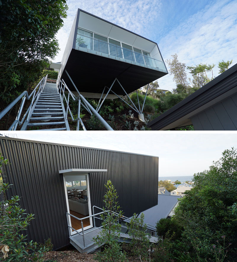 Access to the studio is by way of an industrial galvanized steel set of stairs, which as a visitor climbs, they can see the details of the structure and the Colorbond Spandek cladding.