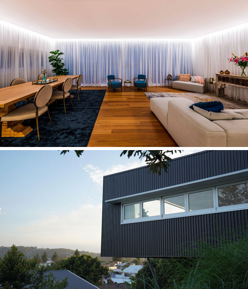 Full height backlit curtains, which run the length of three walls provide privacy day or night and soften the space. Strip lighting running the perimeter provides soft diffused light in the room.