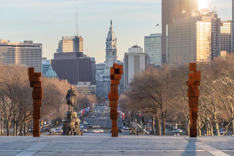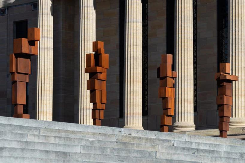 designboom- sculptor antony gormley presents STAND, an installation of ten cast-iron blockworks, as a speculation on how public sculpture in an urban context can re-engage with the subjective feeling of the citizen. each rising ten feet high and weighing nearly three tons, the assemblage of figures is arrayed monumentally along the iconic steps of the philadelphia museum of art. while the series takes a symmetrical, forefrontal occupation along the axis of the grand neo-classical building, the figures are not traditional statues, or portraits of the moral and the great. they are not representative of a national era. rather, each abstracted figure invites the viewer to act as a ‘co-producer’ of the work, to both project and recognize internal affinities within the postural attitude it carries.