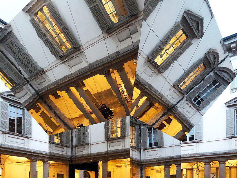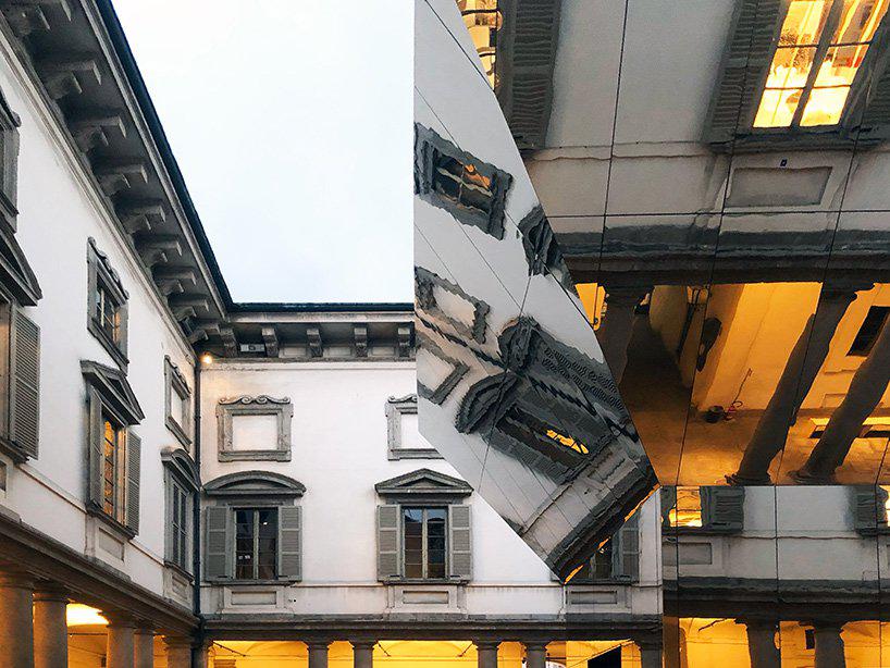 if at ground level visitors will encounter an unprecedented version of the monument, by looking up they will see themselves reflected on an impressive tilted ceiling,’ continues pezo von ellrichshausen. the project forms part of ‘the litta variations’, a show at palazzo litta by mosca partners that brings together more than 22 exhibitors from around the world. see designboom’s continuing coverage of milan design week here.