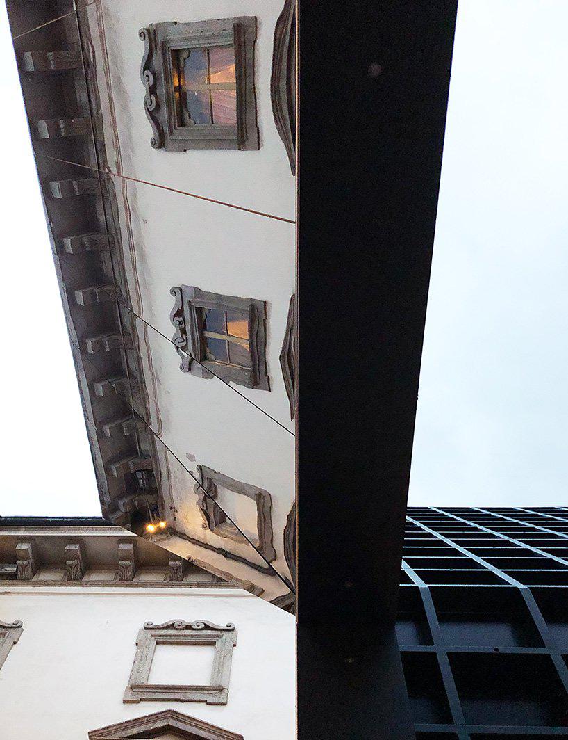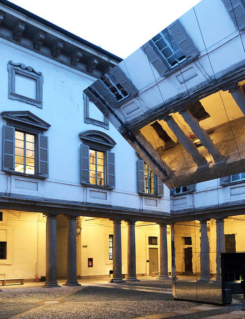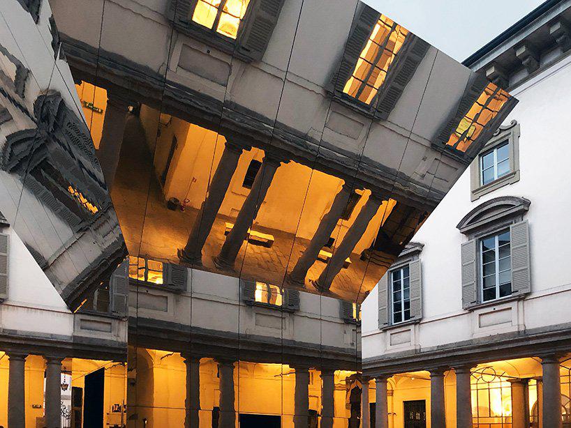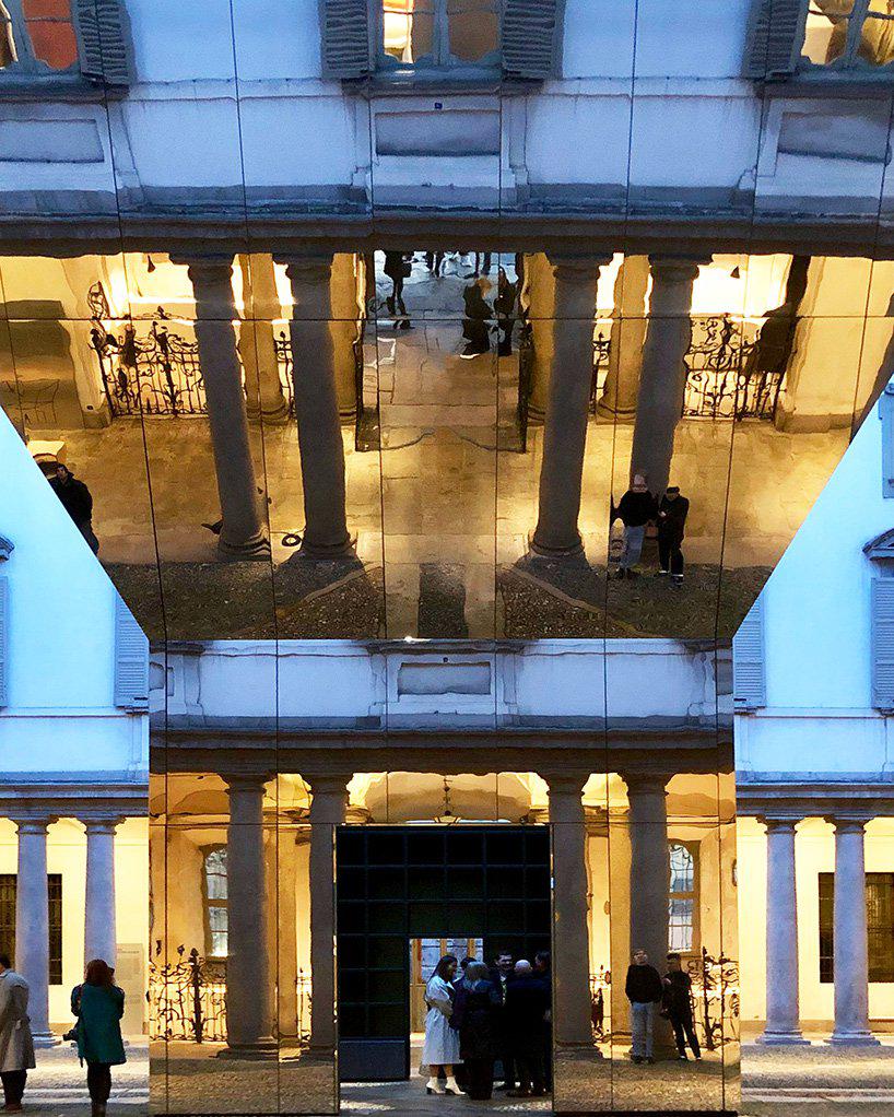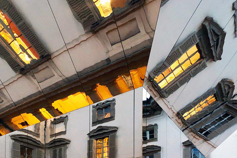 the façades not only reflect the historic palazzo, but also the stone pavement, the colonnades, and the corridor beyond. ‘in its radical simplicity, the pavilion will turn into an immaterial presence that, almost as in a fleeting mirage, will capture the discreet beauty of the three hundred and seventy-year-old palazzo on its flat surfaces,’ say the architects.
