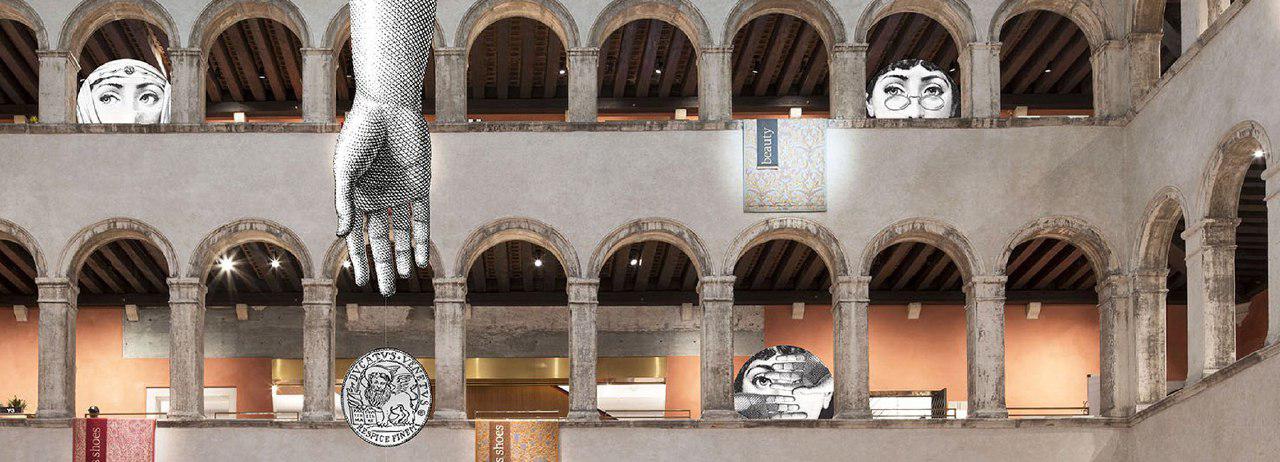 fornasetti‘s la regola del sogno – the rule of dreams will run from may 8 to november 24, permeating throughout the entire fondaco building, from the fourth floor, to the courtyard down to the waterfront entrance. featuring silhouettes of female faces, irreverent monkeys and hands slicing through the air, this installation by barnaba fornasetti and valeria manzi, interacts with the spaces around it and indeed with the very reach of the historical place itself, trifling with its ancient symbols.