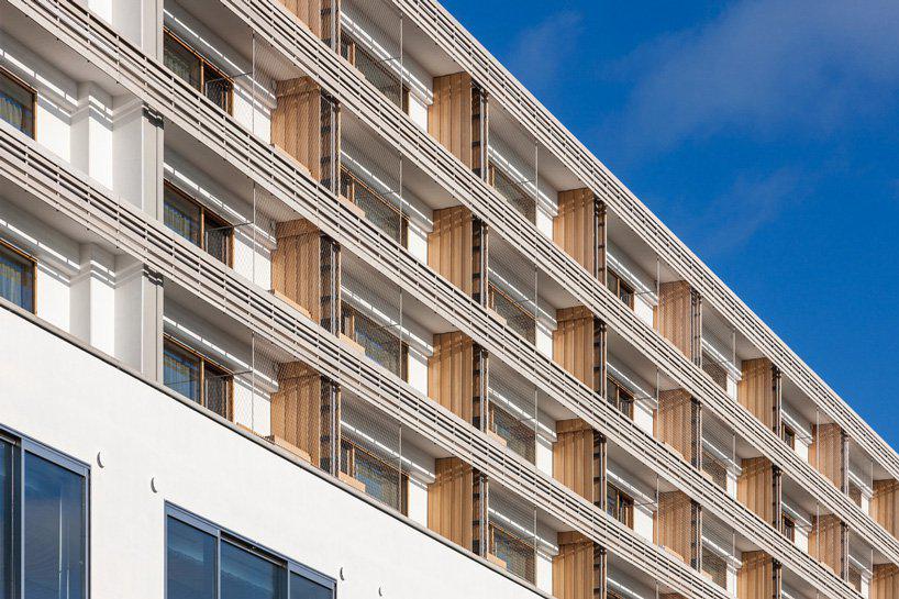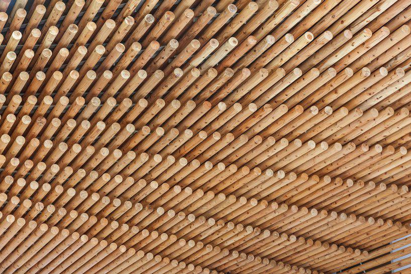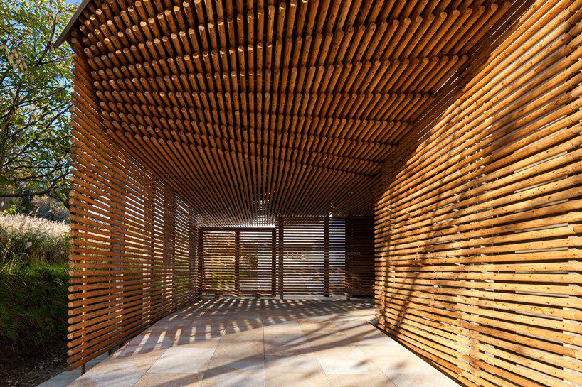 designboom_kengo kuma has transformed a nursing home located by the lake toya, in hokkaido, japan, into a boutique hotel. WE hotel toya features locally produced cedar logs on its façade as well as in its interior spaces that contribute to an overall sense of comfort and warmth for the hotel’s guests.