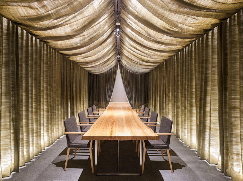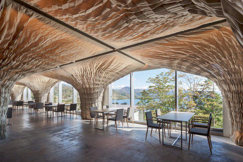 combining wood and fabric in the hotel‘s exterior and interior areas, kuma has created a series of theatrical yet harmonious spaces. a cave-formed space made of pleated cloths makes the hotel’s bar & restaurant, which offers great views of the lake in front. each guest room features a hinoki (cypress) bathtub in its balcony, allowing guests to enjoy the landscape and the qualities of the tree.