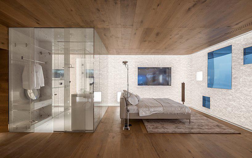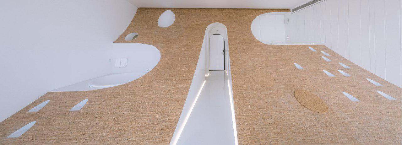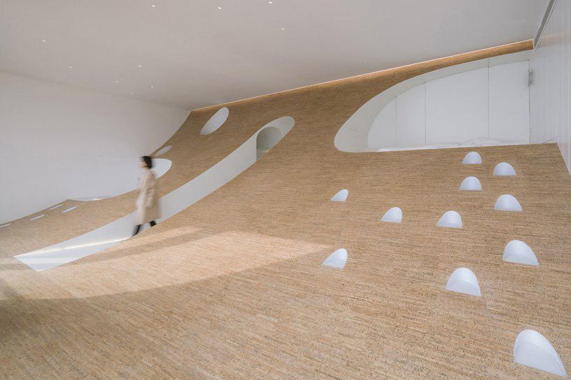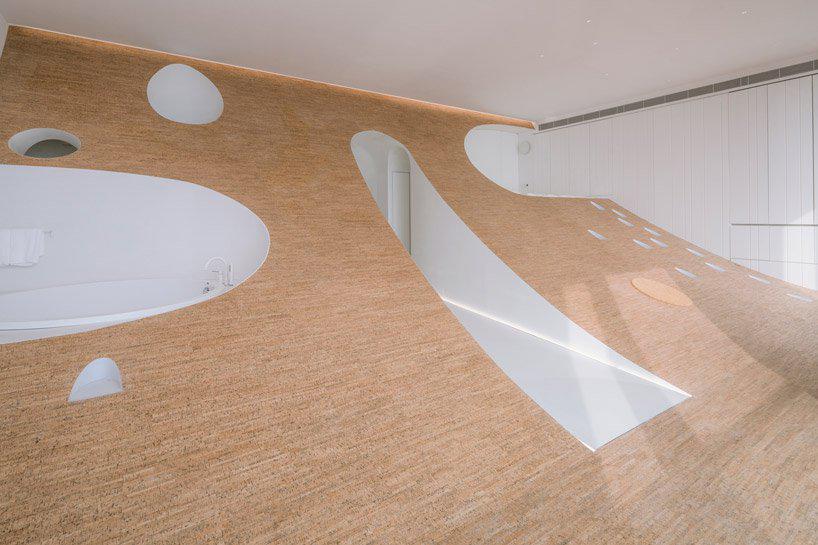 hillside dwelling’ envisioned by ARCHSTUDIO began by looking at the evolution of human living spaces, with the resulting design aiming to return to these origins and stimulate interaction between people and the outdoor environment. the floor has been raised to create a ‘hillside’ covered in cork-boards. within this structure, facilities are placed according to their function, such as a washroom underneath and a sleeping and bathing space on the face of the gradient, allowing residents to gain views out. the interior is defined by human scale and physical behaviours, and in essence, intends to forge a connection between the artificial and the natural, providing a unique sensory and physical experience.