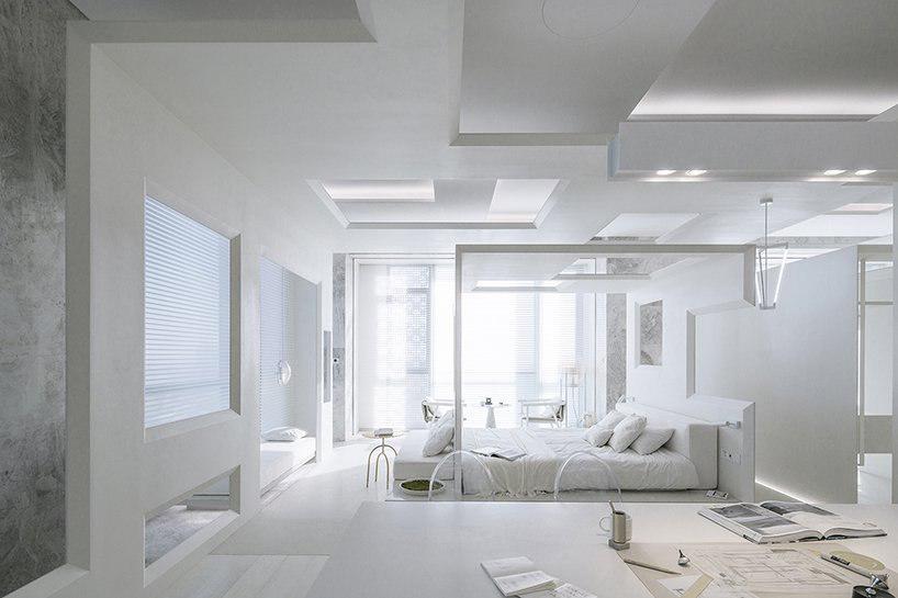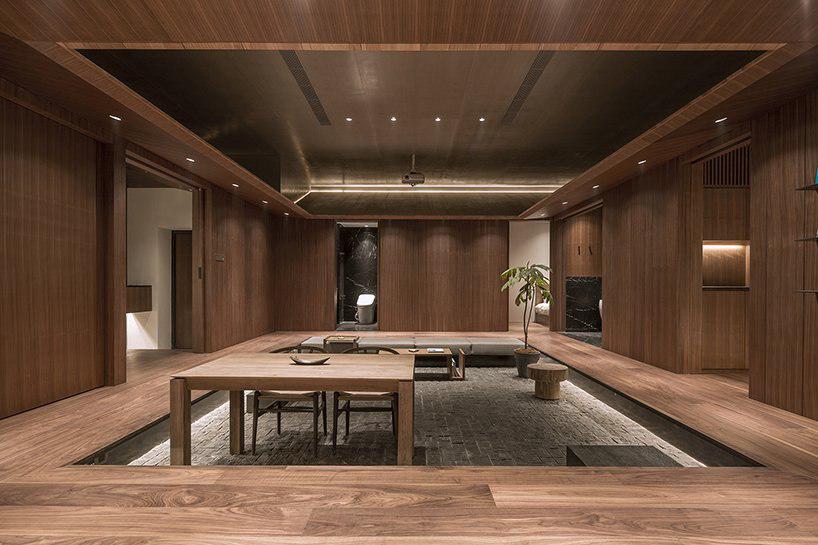 for the design of ‘harmony courtyard’, shuhei aoyama considered how best to create a comfortable contemporary living space for a less traditional household – a one-person household. covering an area of 1292 ft2 (120 m2), the interior space breaks with traditional layouts. the design team dismantled all the partition walls in the original space, and created a courtyard-like public area in the middle of the space. the space appears to be a traditional chinese courtyard when looking down at it. if the roof is removed, the bedroom, toilet, shower room, and kitchen, etc. around the yard could be seen from above. the designer tried to compress the private space as much as possible, so as to leave more space for the public area, where life will be enjoyed. this home is no longer a closed living space, but a dwelling for the emerging one-person households, which is more open and embraces more possibilities.