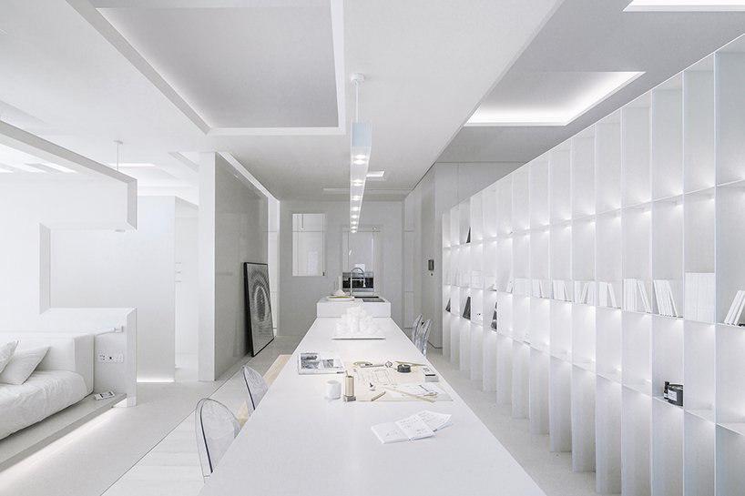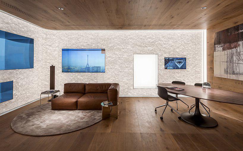 for SODA architects, breaking the physical boundary and making use of video images as a way of connecting different dimensions is the starting point for their spatial design. the designers used digital materials to break the physical boundary, with a view to achieving an elegant fusion of the ‘screen wall’ and ‘transparent wall’. the most direct medium connecting the indoor space and the outside world is the window. therefore, the designers rearranged the window areas and extended the geometric texture of the rectangle to the closed solid walls on two sides of the space unit. four screens of different sizes are respectively embedded into three walls, which are set to play content of distinctive themes, such as paris live, NASA’s 24-hour live broadcast, and live local TV channel in beijing, so that people can feel and see diversified situations of different time zones.