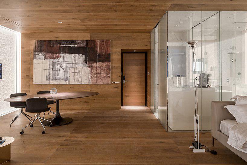 designboom_to explore the possibilities of future lifestyles, new everbright center invited five designers, comprising of shuhei aoyama, han wenqiang, jiang yuan & song chen, and tang chung-han, to design four guest rooms in beijing‘s artpark9. the project results in four very distinctive spaces that each intend to create an ideal contemporary living space within an urban context that centers on oriental philosophy. the project includes, ‘hillside dwelling’, ‘in between’, ‘borderless space’ and ‘harmony courtyard’.