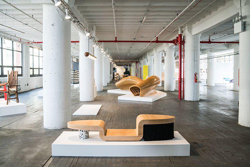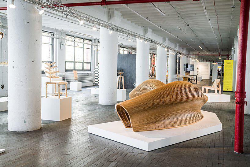 designboom_whether steam bent, sculpted, carved, or cut, wood is the word at wanteddesign brooklyn’s highlight exhibition, ‘TIMBER!’. designers, carpenters, cabinetmakers, and woodturners are thrust into the spotlight in a showcase of experimental and exploratory collectible art and design pieces all made in industry city. IC — a network of 16 former factory buildings on the waterfront of sunset park, brooklyn — is home to a thriving community of creatives and makers who have honed their craft for decades. these works in wood for TIMBER! celebrate the fabricators and manufactures that carry on the torch of the complex’s rich industrial past._