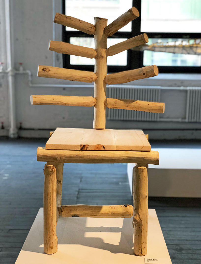 several of the artists and designers featured in the exhibition explore the idea of wood more abstractly and playfully — like sebastian errazuriz’s walnut-crushing stool made from lacquered wood, and chen chen & kai williams’ angular prototype for an emerald ash slotted chair.